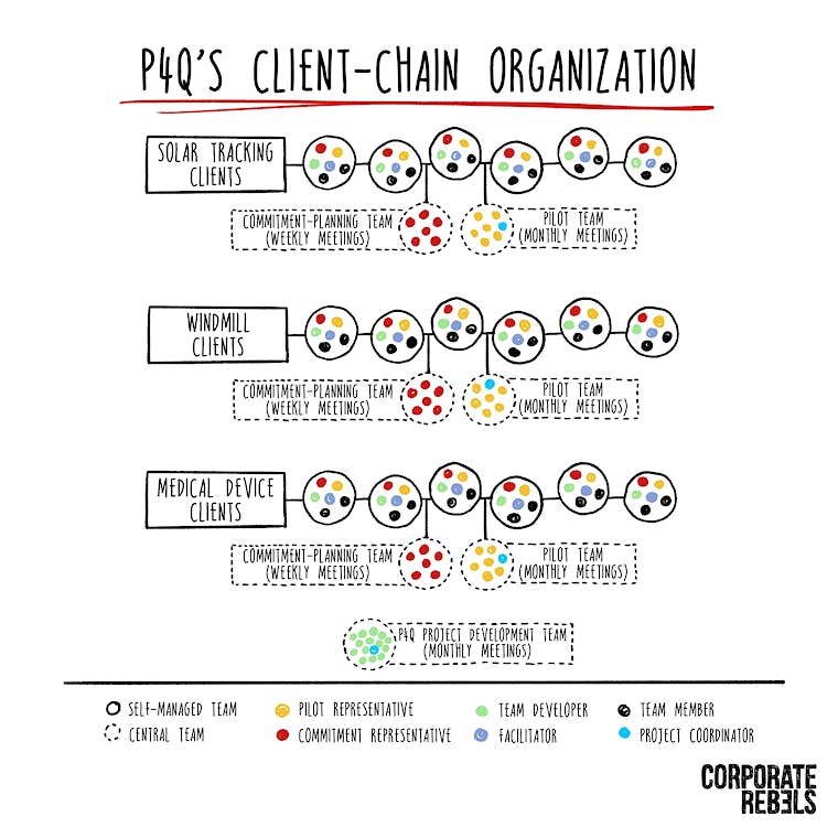 Next to all the decentralized teams that work in their "client-chains", there are also three "central teams": the pilot team, the commitment team, and the P4Q project developer team.